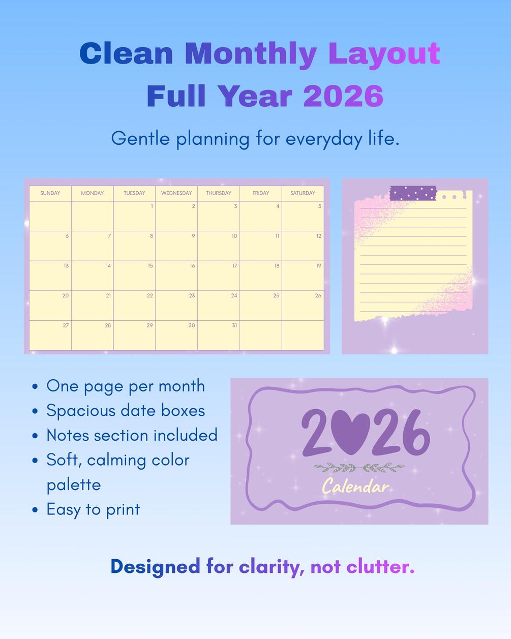 • 13-page printable PDF(1 cover page + 12 monthly calendar pages for 2026)